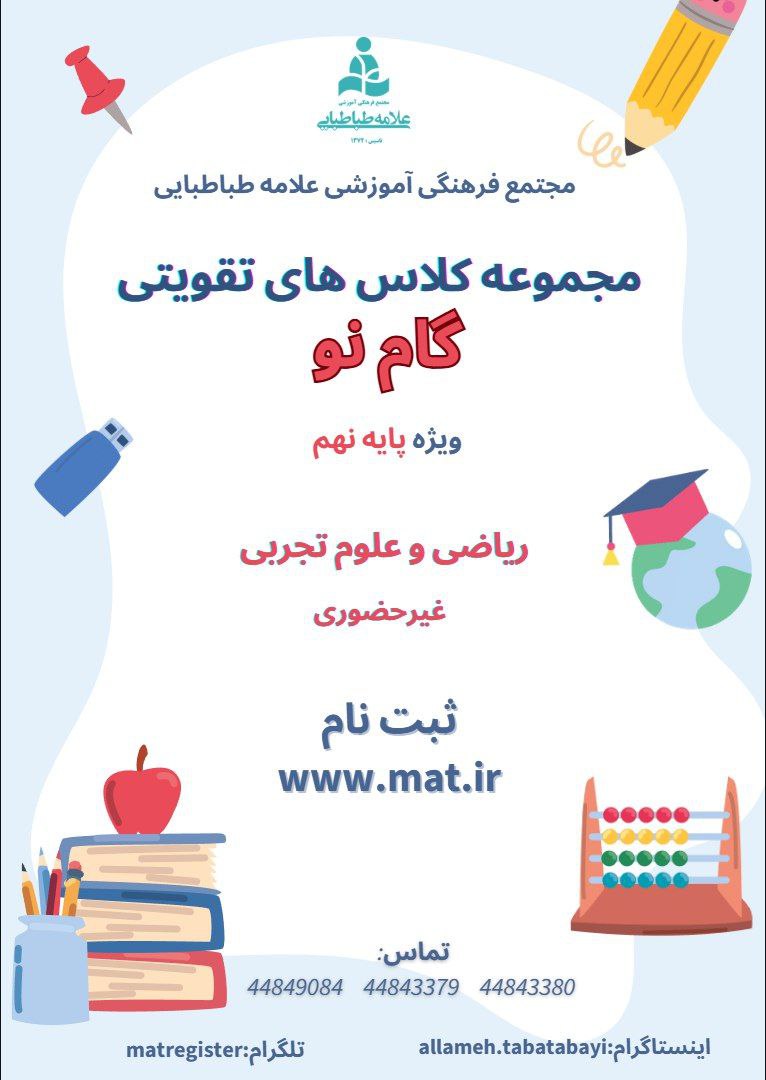 لذا مجتمع فرهنگی آموزشی علامه طباطبایی با توجه به موفقیت برنامه ۱+۵ در سال گذشته و درخواست اولیای سایر پایه ها، بار دیگر جهت انجام رسالت اجتماعی خود و با هدف تقویت پایه تحصیلی دانشآموزان پایه نهم، اقدام به برگزاری مجموعه کلاسهای تقویتی گام نو کرده است. این دوره با محوریت دروس ریاضی و علوم تجربی طراحی شده و بهصورت کاملاً رایگان و غیرحضوری در اختیار دانشآموزان قرار میگیرد. هدف اصلی این برنامه، فراهمکردن فرصت برابر برای دانش آموزان و ایجاد مسیری مطمئن جهت رشد تحصیلی است.
